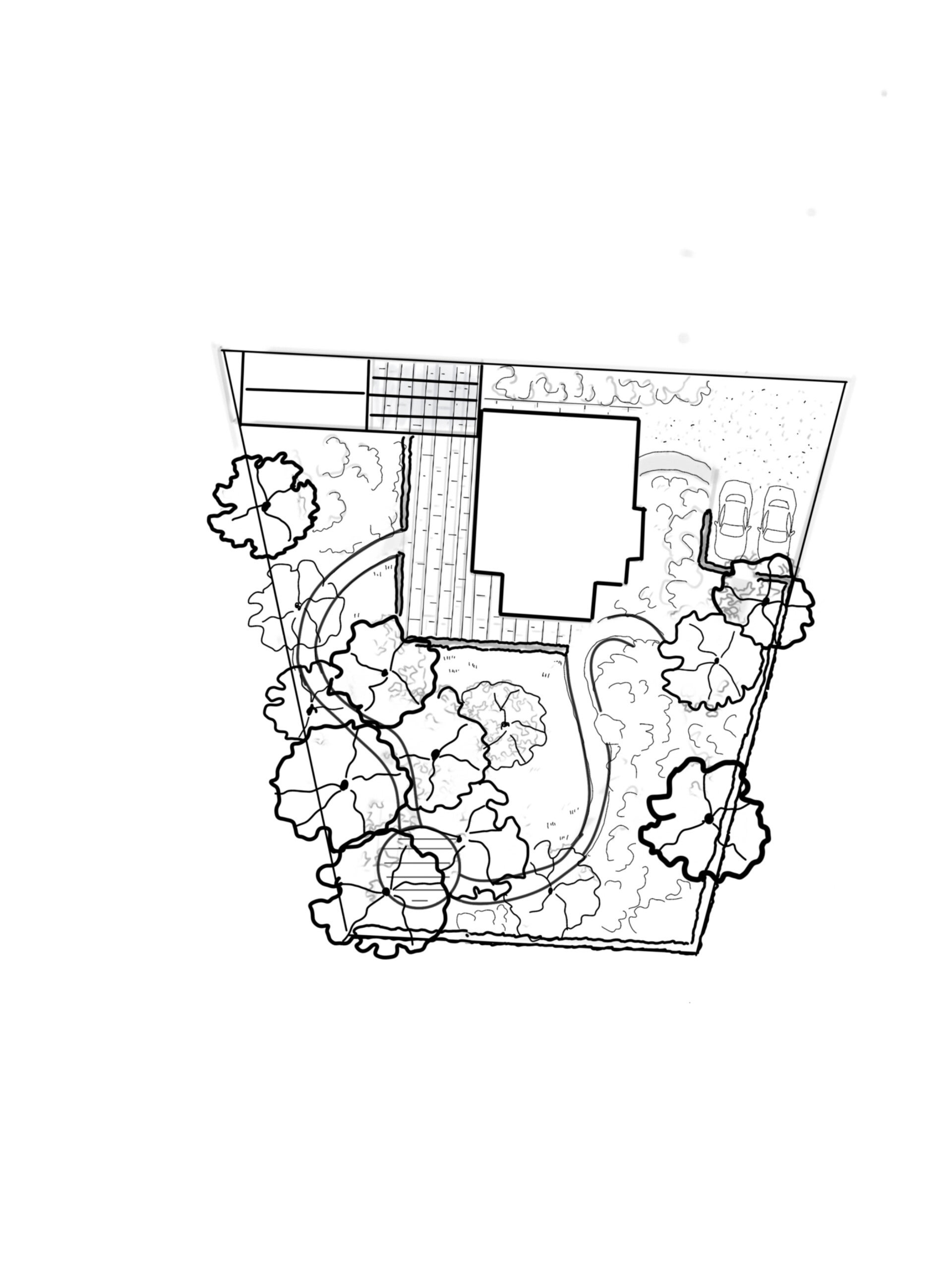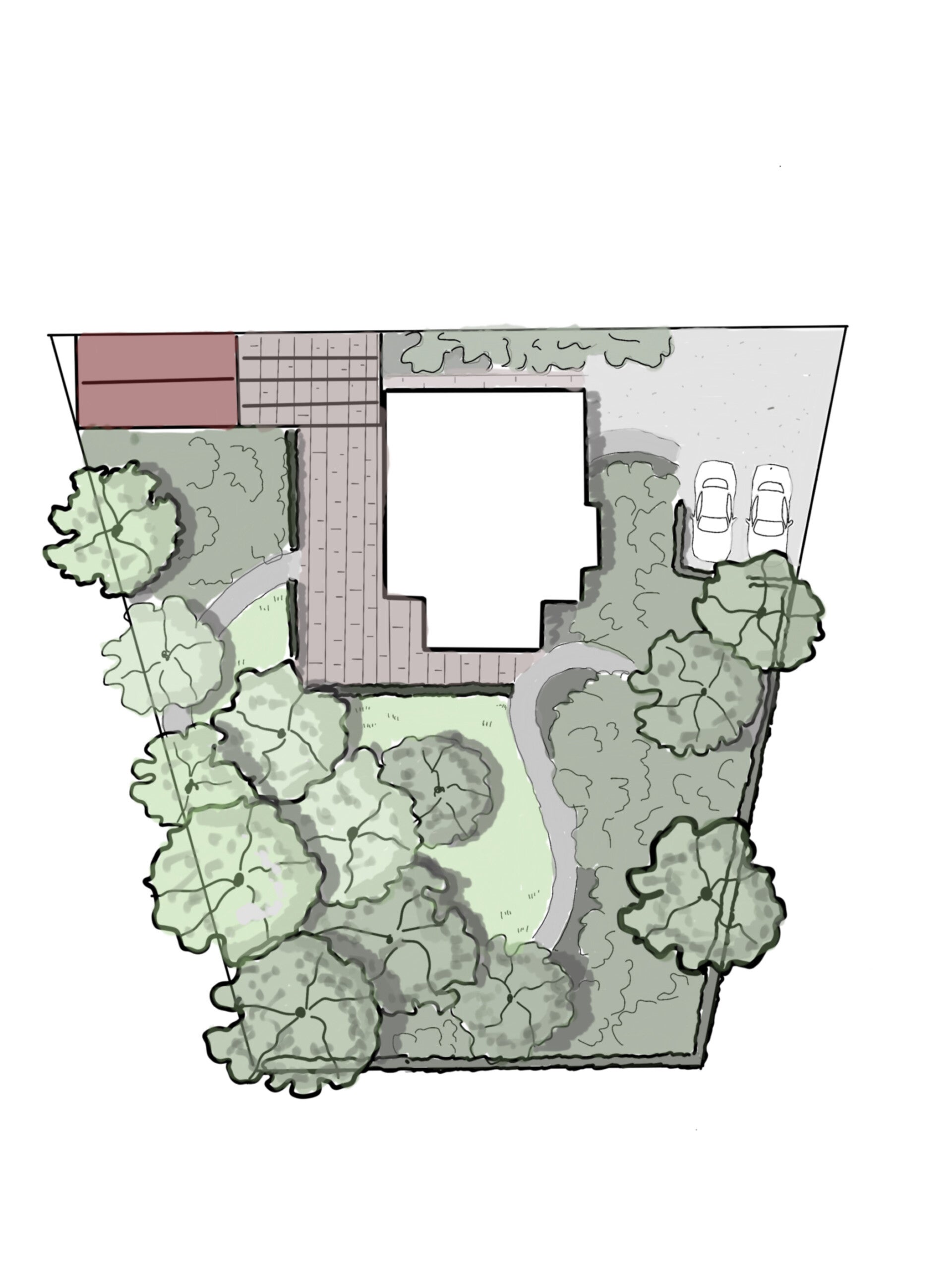 Vanaf het verborgen terras volgt het pad de weg terug en leidt weer naar de voorkant van de woning. Daar maak ik de verbinding naar de parkeerplaats waar de bewoners graag plek wilden voor twee auto's.